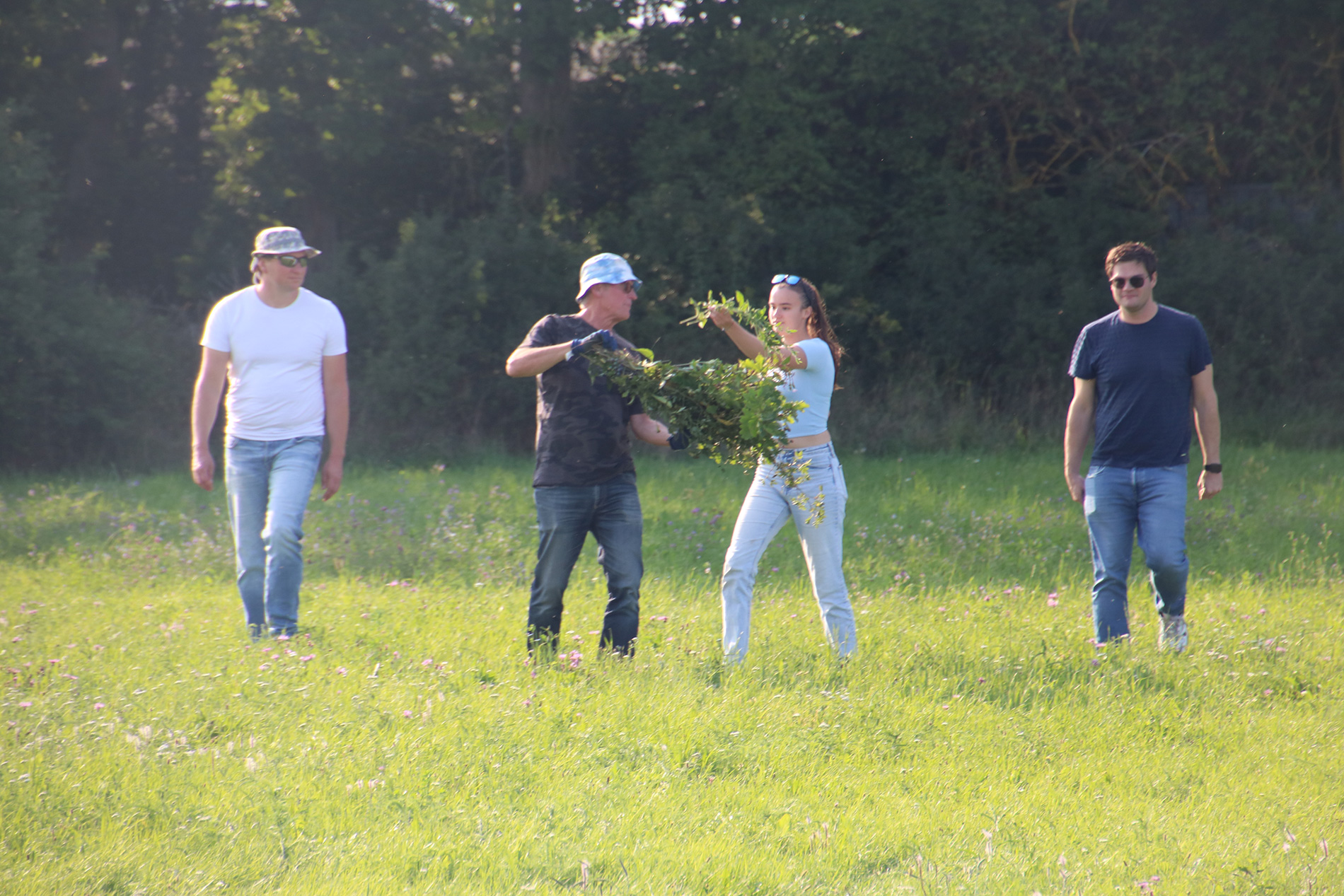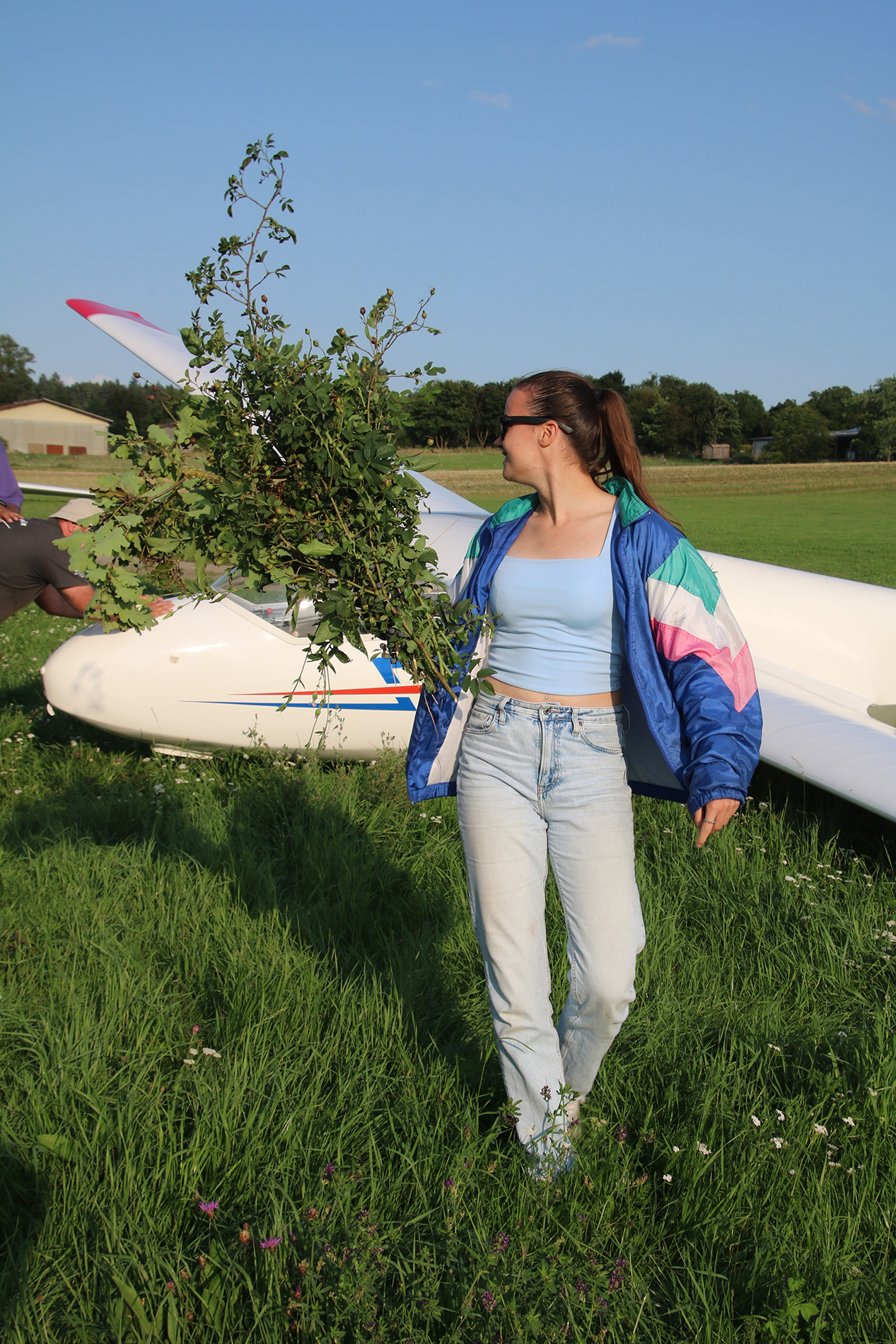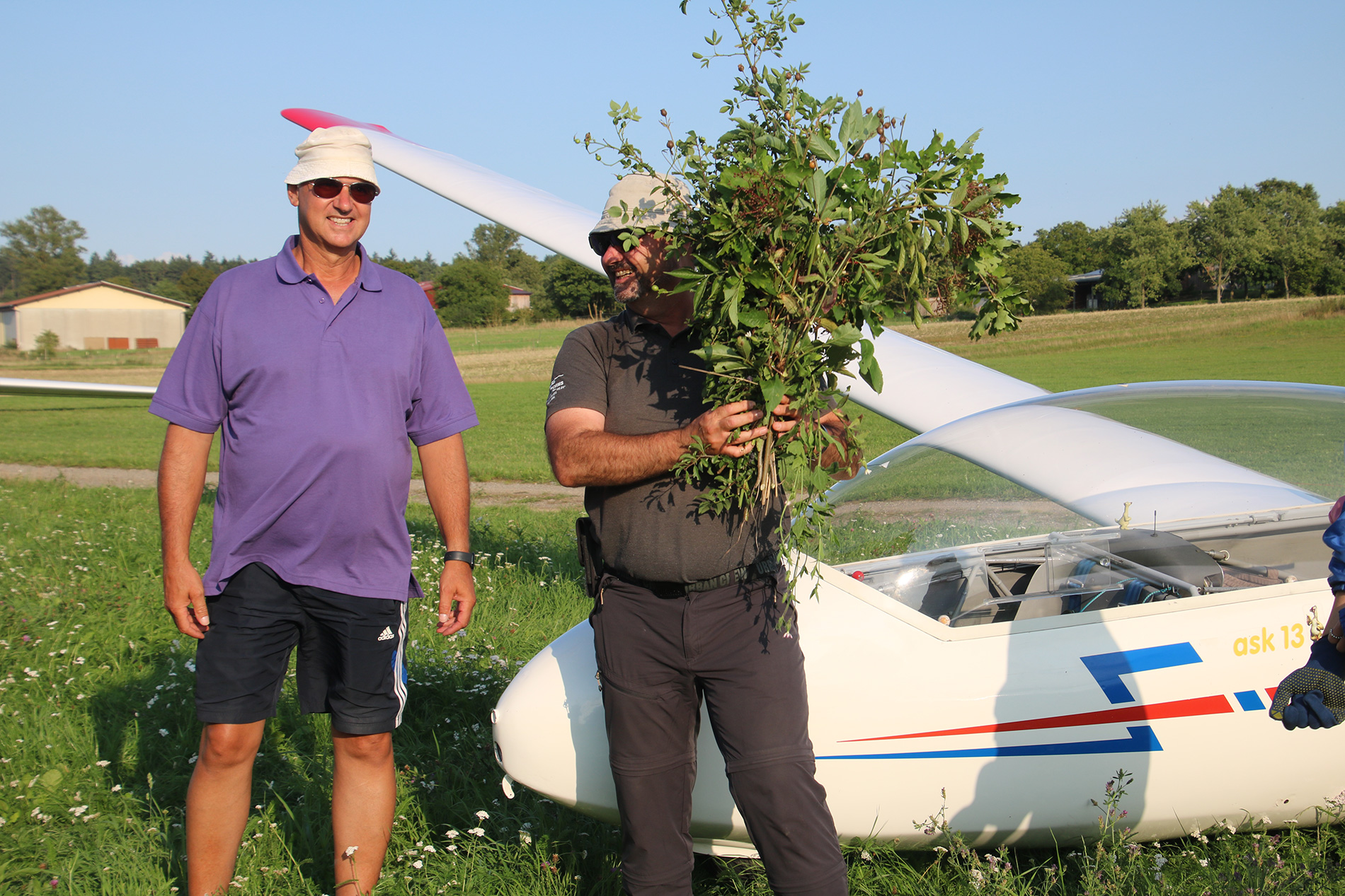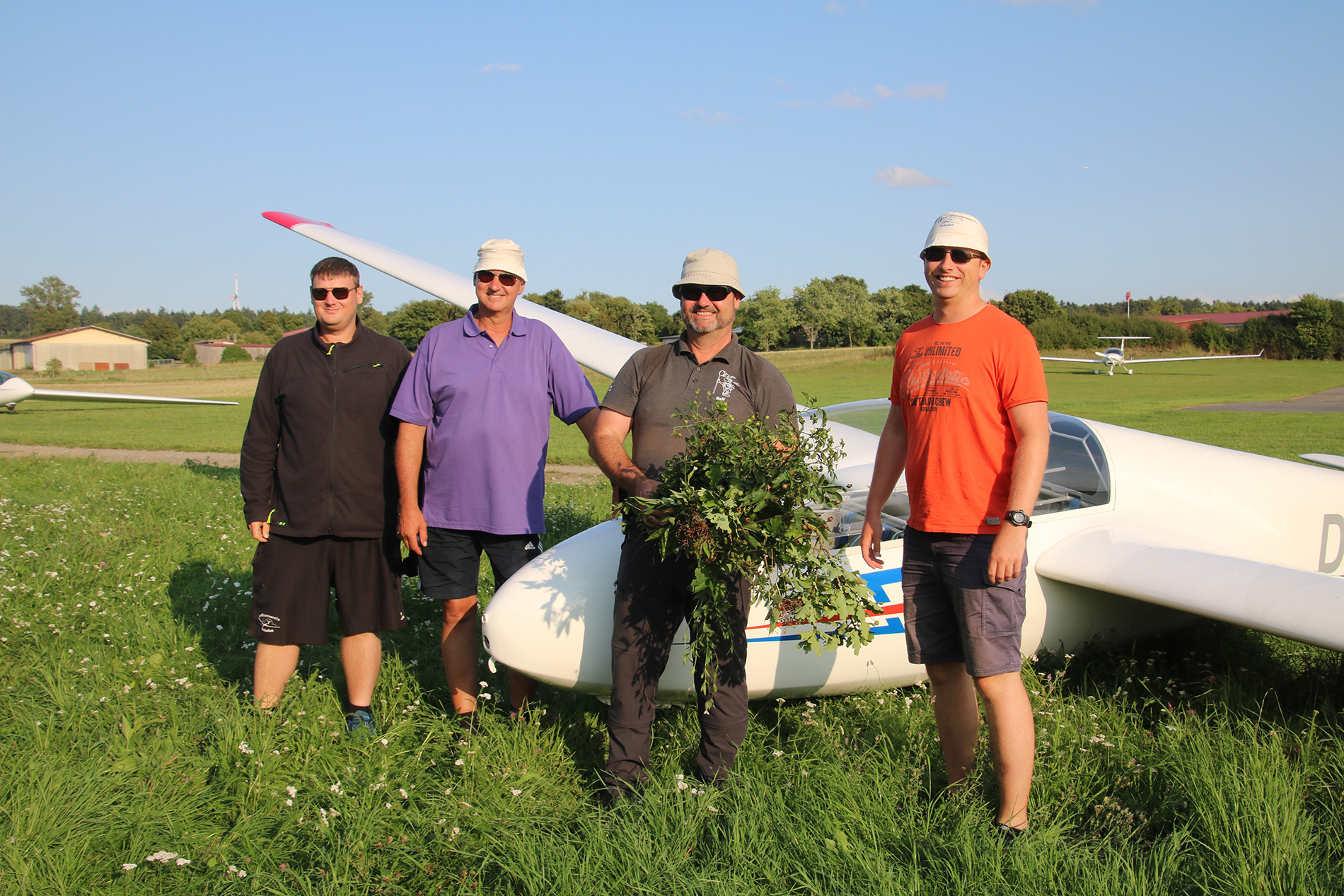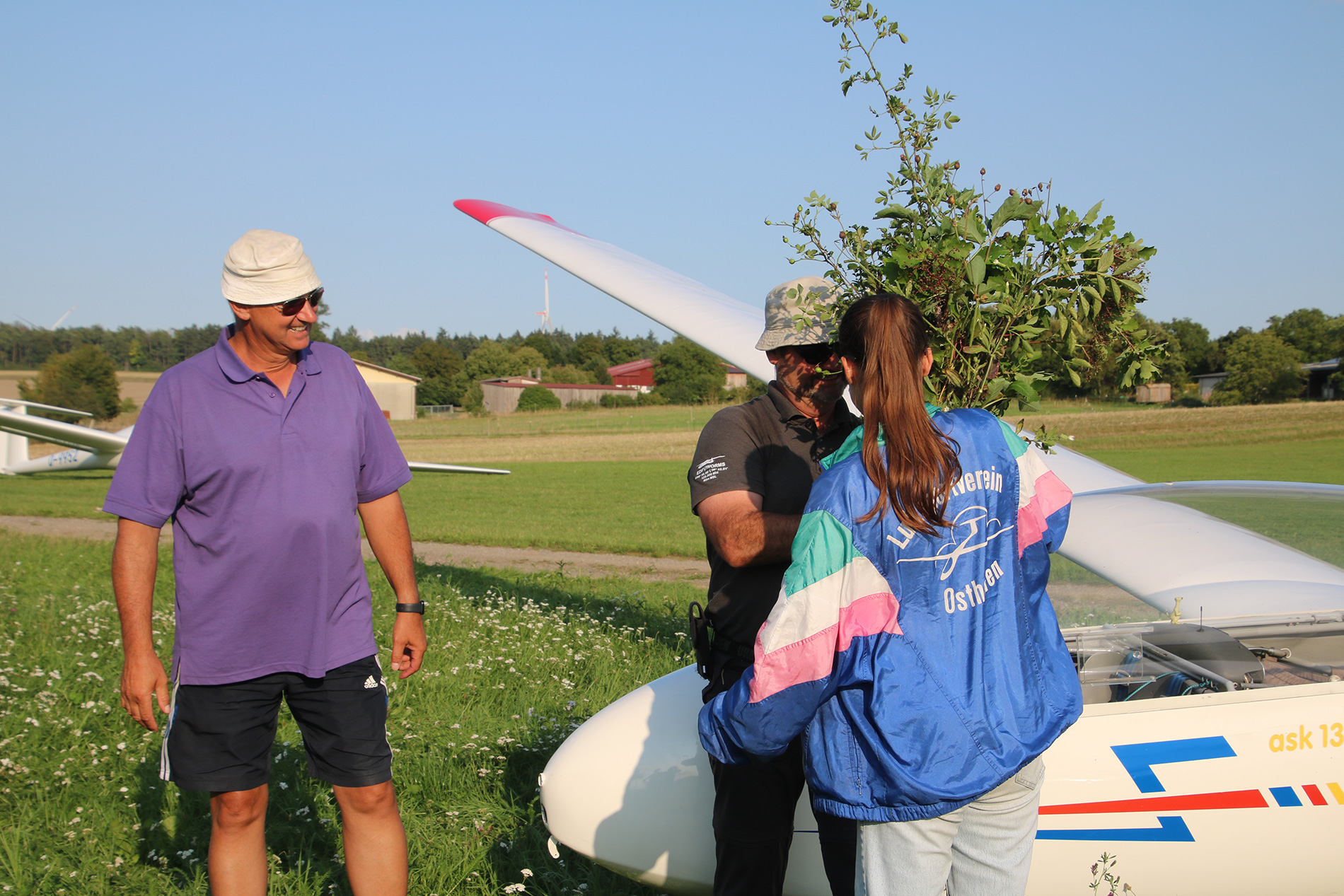 Im Anschluss honorierten die Kameradinnen und Kameraden diese Leistung mit dem traditionellen Schinkenklopfen, er bekam also von jedem anwesenden einen Klaps auf den Po um für künftige Thermikflüge zu sensibilisieren. Ein selbst gepflückter dorniger Strauß wurde ebenfalls überreicht.